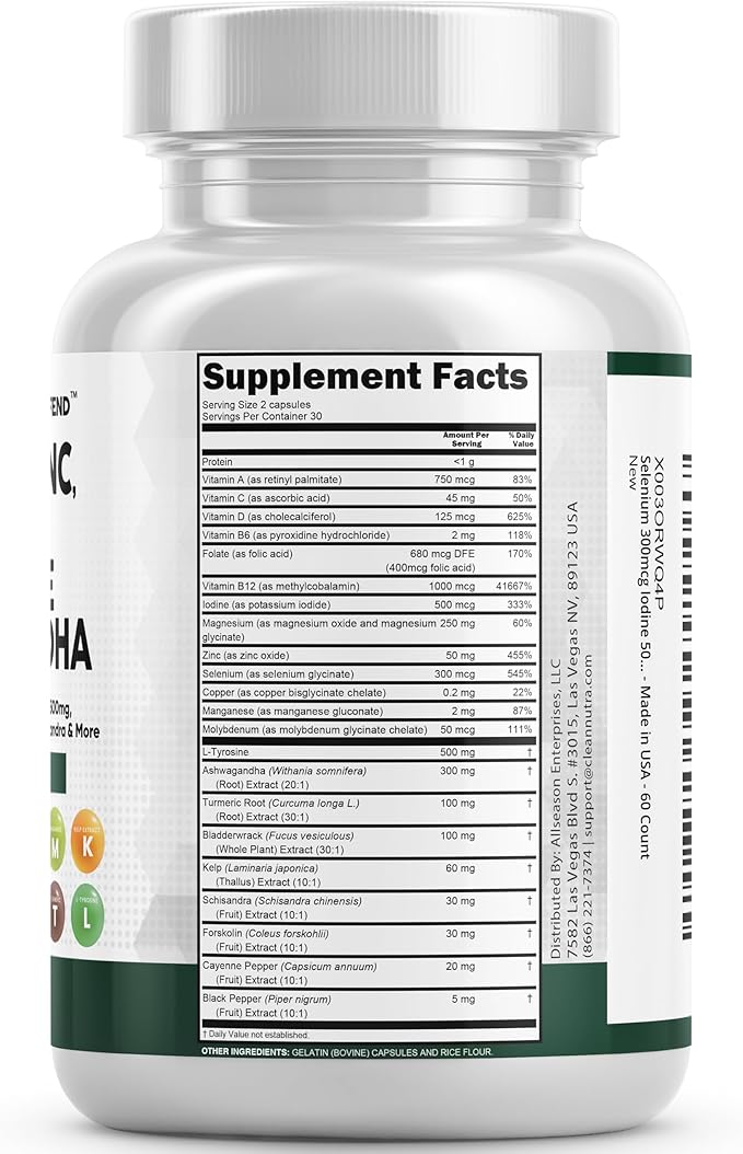 Clean Nutraceuticals Selenium 300mcg Zinc 50mg Iodine 500mcg L Tyrosine 500mg Ashwagandha - Thyroid Support Supplement for Women & Men w/Bladderwrack, Turmeric, Kelp, Schisandra - 60 Capsules