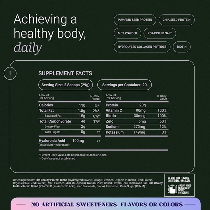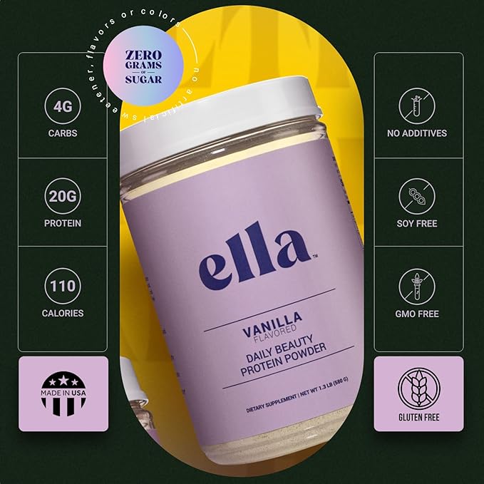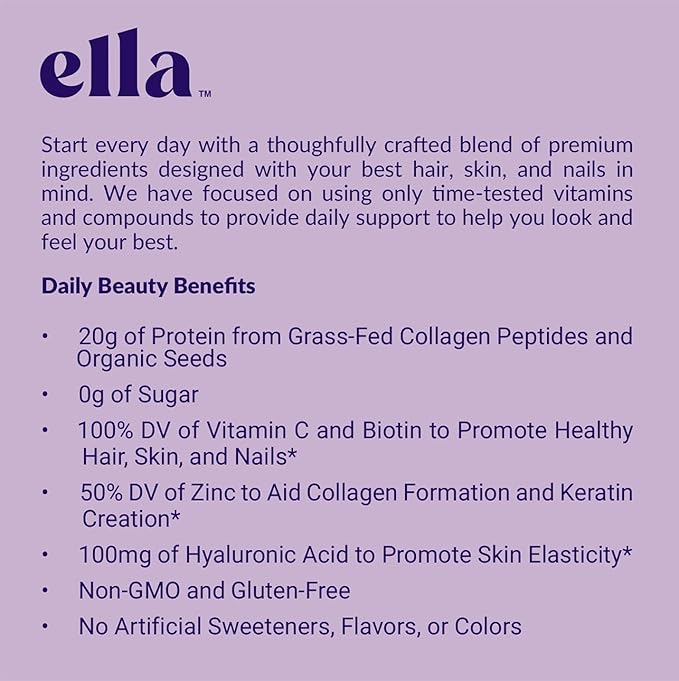 - BOOST COLLAGEN PRODUCTION: Zinc and vitamin C in Ella Beauty Protein increase your natural collagen production to replenish natural levels to reduce wrinkles and lines and for optimal skin texture and elasticity.