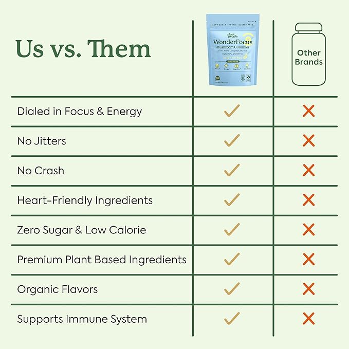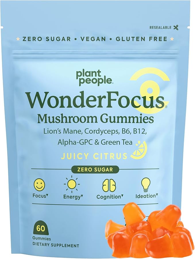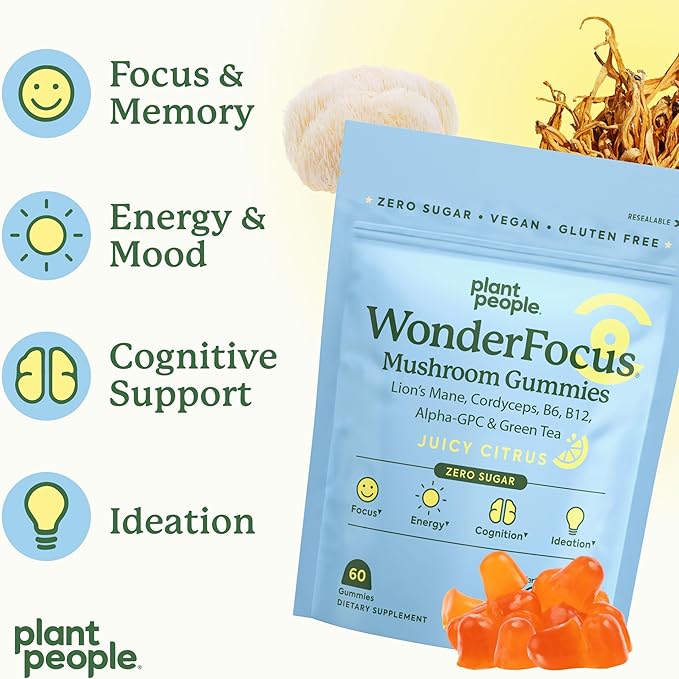 - Product Benefits : Plant People WonderFocus Mushroom Gummies with Lion’s Mane & Cordyceps - Nootropic Brain Supplement Boosts Memory, Focus, Energy & Mood in Adults | No Sugar, 100% Vegan, Citrus Flavor, 60 Count Plant People WonderFocus Mushroom Gummies with Lion’s Mane & Cordyceps - Nootropic Brain Supplement Boosts Memory, Focus, Energy & Moo… See more