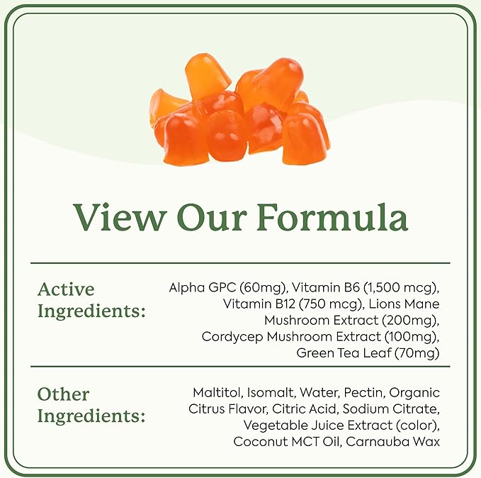 - Sugar-free super mushroom gummies - Our nootropic brain support supplement is vegan-friendly & gluten-free. Each gummy has a citrus flavor. These focus gummies for adults are non-GMO and lab-tested. They do not contain food dyes, sugar alcohols, gelatin, or high-fructose corn syrup. Enjoy 2 gummies daily when in need of focus or as a delicious midday treat!
