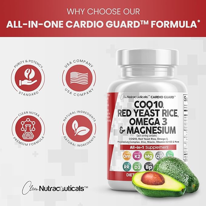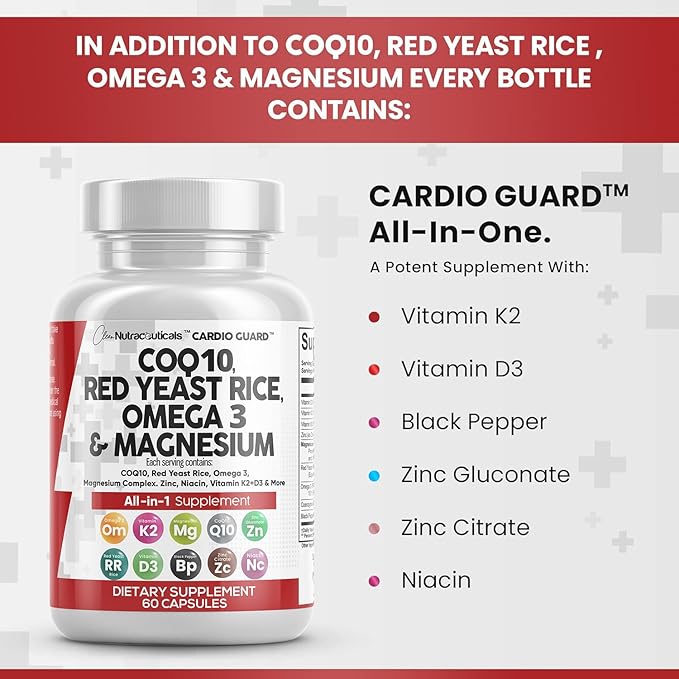 - The All In One CoQ10 and Red Yeast Rice Supplement You've Been Looking For - Clean Nutra CardioGuard provides 8 full-dose products in one complex containing a full CoQ 10, Red Rice Yeast Supplement, Omega 3 Fatty Acid Supplements, Magnesium Capsules, Niacin, Zinc, and Vitamin K2 D3 in a convenient 2 capsule dosage. Finally, a stronger supplement than red yeast rice 600 mg. capsules, and omega 3 have been packed into one convenient solution.