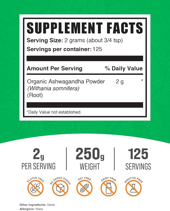 BulkSupplements.com Organic Ashwagandha Powder - Organic Ashwagandha Supplements, Sourced from Ashwagandha Root - Gluten Free, 2g per Serving, 250g (8.8 oz) (Pack of 1)