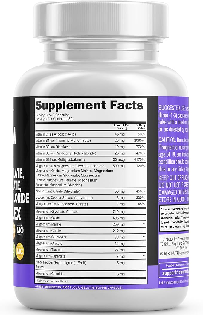 Clean Nutraceuticals Magnesium Complex 2285mg with Magnesium Glycinate Citrate Malate Oxide Taurate Aspartate Orotate & Mag Chloride, Zinc Copper Manganese & Vitamin C B1 B2 B6 B12 Complex - 1Pack