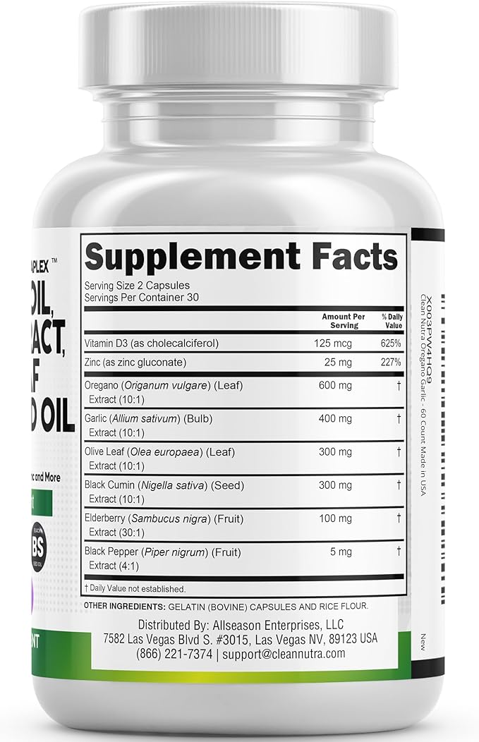 - Advanced Oregano Supplement & Garlic Supplements for Women and Men - Our product takes oil of oregano powder and garlic pills and combines them with Olive Leaf Extract, Black Seeds, and Elderberry Supplements and the results are amazing. Normal Garlic Capsules are found as garlic extract softgels or garlic oil supplement. However, Clean Nutra has officially created an even more potent all in one immune support and digestive supplement.