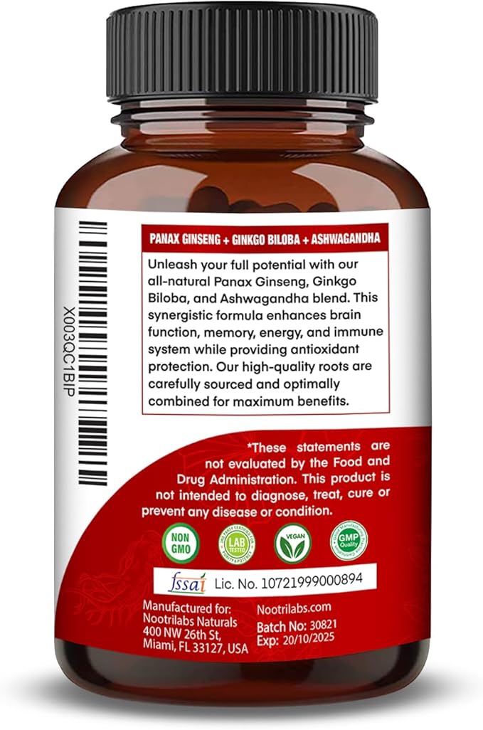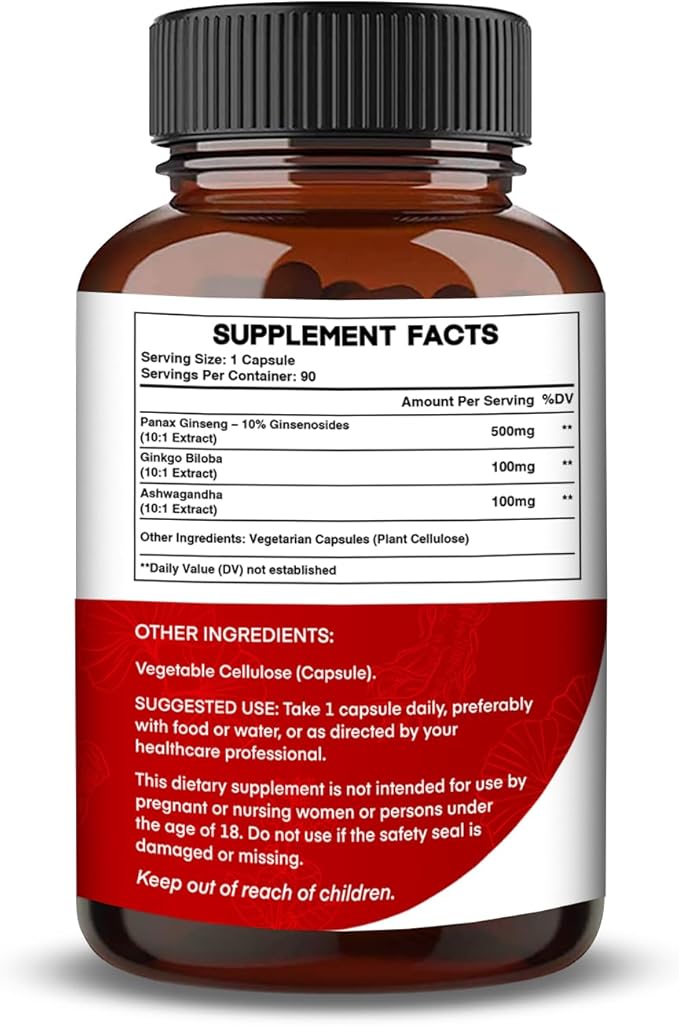 - ✅ Powerful Herbal Blend: Experience the combined benefits of Korean Red Ginseng, Ginkgo Biloba and Ashwagandha extract in one convenient supplement. Each capsule contains a potent 750mg dosage, ensuring you receive the full support of these traditional herbs work together to help improve cognitive function, memory, and concentration.