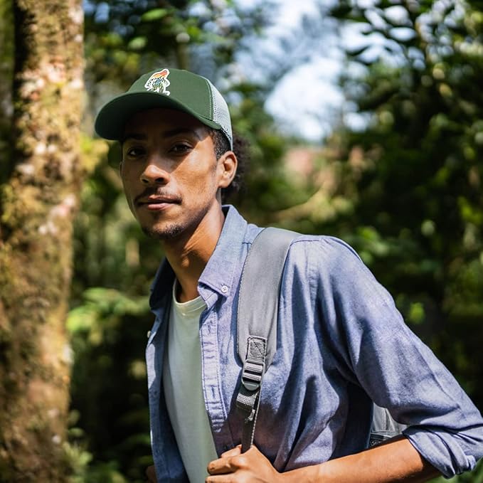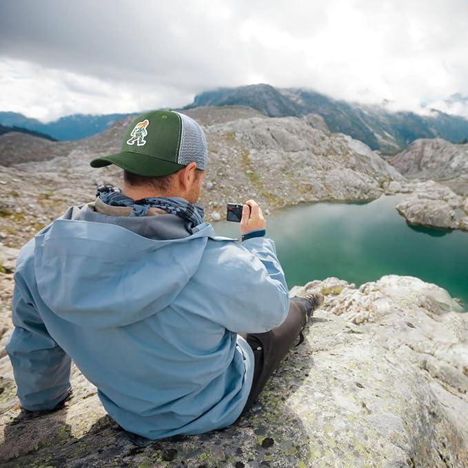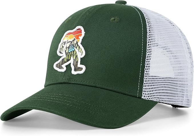 - Wild Bigfoot Designs: Features a Sasquatch logo that combines forest and mountain designs embroidered on the front of the Bigfoot hat. These trucker hats will soon become your favorites. Because you will get comments and compliments on it wherever you wear this Sasquatch hat.