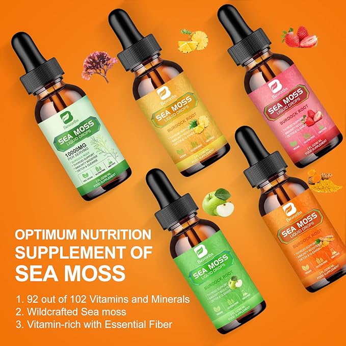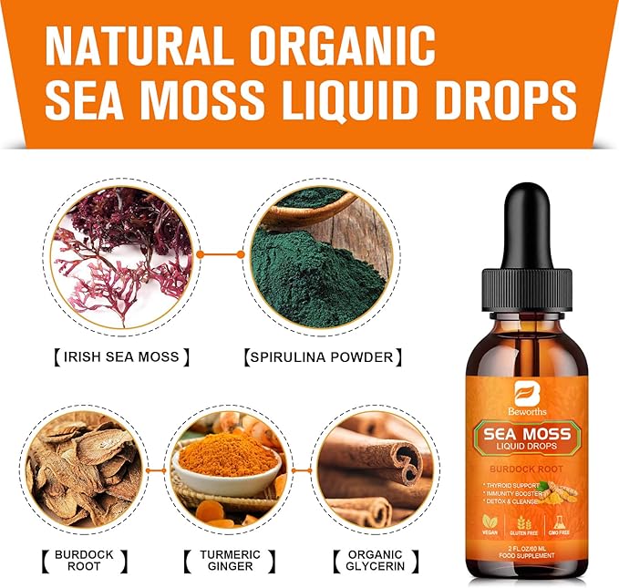 - 【Organic Nutrient-Rich Sea Moss】: Our organic Irish sea moss liquid drops are powerful drinking energy supplements. Sea moss drops supplement includes the ingredients of organic Irish sea moss, burdock root, and spirulina powder, turmeric ginger and vitamin to deliver vitamins and minerals for your body's maximum nourishment.
