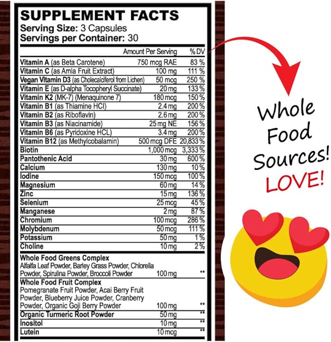 Whole Food Multivitamin Fruit & Super Greens All-in-one Vitamin Complex, 90 Vegan Capsules - Daily Vitamin for Women and Men - Iron, Zinc, B12, Vitamin A, D3 and More