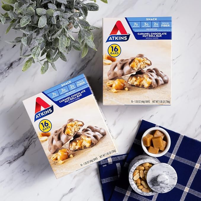 - AT HOME OR ON-THE-GO. Atkins Caramel Chocolate Nut Roll Snack Bars. Enjoy delicious snack bars that fit right into your busy schedule, with 7g of protein, 3g of net carbs and 2g of sugar per serving*. This is Today’s Atkins.