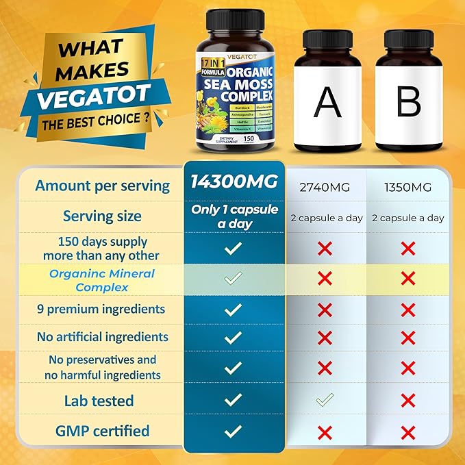 - ππππππ¦π§ π£π’π§ππ‘ππ¬: Vegatot Sea Moss Supplement combines 17 powerful ingredients, specially selected for their unique beneficial properties. Moreover, each capsule contains 14,300mg of concentrated herbal powder to ensure maximum advantages. Our advanced formula eliminates the need for multiple supplements. Taking only two capsules per day is enough to experience the full advantages of this unique formulation.