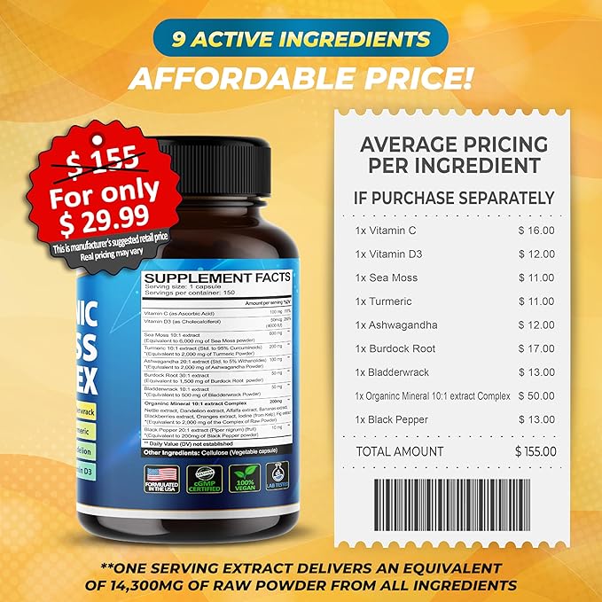Organic Sea Moss 14,300mg with Bladderwrack, Burdock, Ashwagandha, and Turmeric - Immunity Booster for Healthy Aging, Skin & Joint Support- Made in The USA (150 Count (Pack of 1))