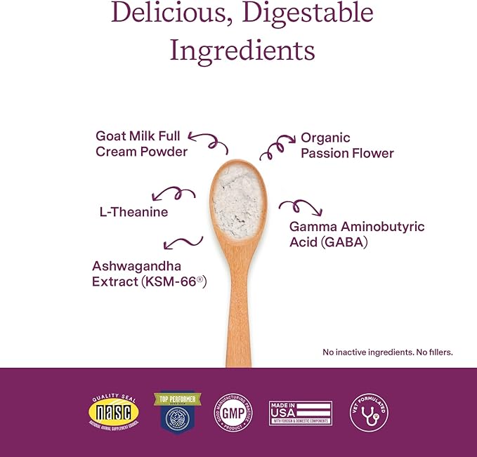 - Active Ingredients : Goat Milk, GABA, Passion Flower, L-Theanine, KSM-66, Ashwagandha
