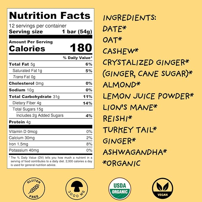 Wise Bar Adaptogen Mushroom Nutrition Bars | Lemon Ginger Flavor | 12 Count | Functional Mushrooms and Adaptogens Bar | Organic Nutrition Energy Bars, Vegan, Gluten Free