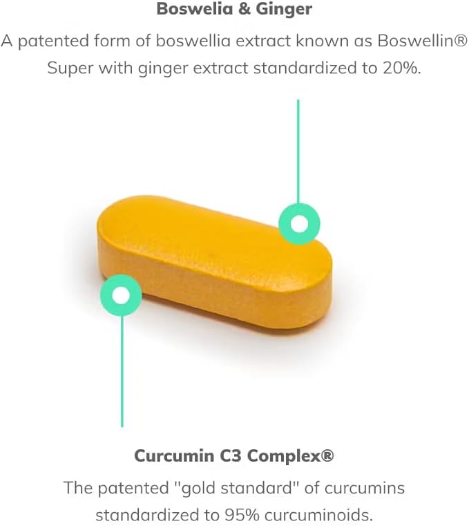 - Synergistic Formula for Maximum Joint and Inflammation Support: Curcumin Plus features a powerful combination of patented Curcumin C3 Complex (Turmeric), Boswellin Super (Frankincense), BioPerine (Black Pepper Extract), and Ginger. This carefully curated blend works synergistically to provide enhanced anti-inflammatory, antioxidant, and joint support benefits. Together, these ingredients are designed to help relieve discomfort, promote flexibility, and maintain overall joint health.