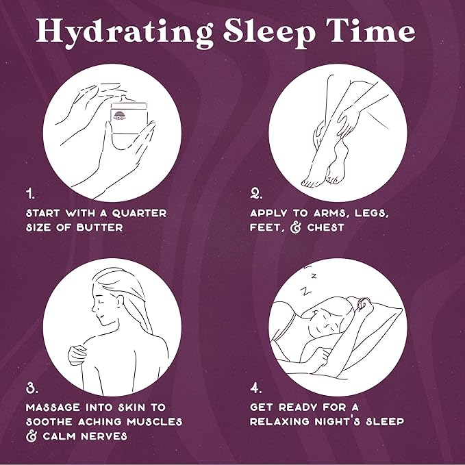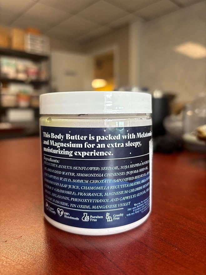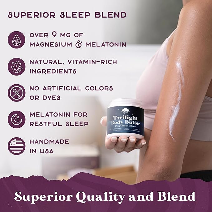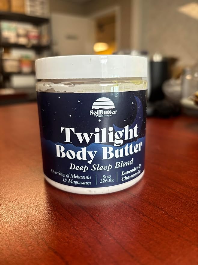 - Drift into a peaceful slumber with our Purple Canyon Lavender Chamomile Deep Sleep Body Butter. Infused with Magnesium and Melatonin, this soothing formula is designed to help you fall asleep faster and enjoy a restful night’s sleep. Let the calming aroma of lavender and chamomile lull your senses while the skin absorbs the stress-relieving benefits of Magnesium and the sleep-promoting properties of Melatonin, for a truly rejuvenating experience.