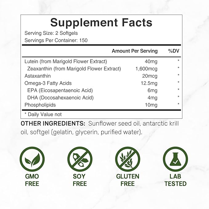 - Dosage & Servings - 300 softgels per bottle, 2 softgel serving size, delivers 40mg lutein with 1,600mcg zeaxanthin from a marigold flower extract, as well as 20mcg astaxanthin with 12.5mg omega-3s and 10mg phospholipids per dose, lasts up to a 150-day supply.