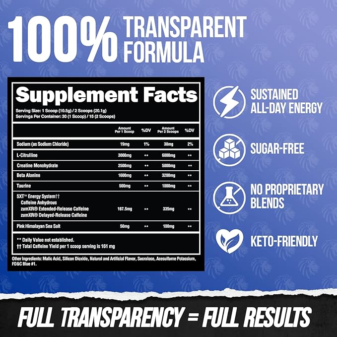 - GREAT TASTING CAFFEINE MATRIX: Our CORE pre-workout powder is powered by our all new SXT Sustained Energy and Focus System. This tri-source caffeine matrix will provide you with more sustained energy and focus vs the standard forms of caffeine used in other pre workout supplements. Our Razzle Mania "Blue Raspberry flavor" will be like enjoying a delicious, top-shelf cocktail drink from a professional mixologist vs taking nasty shots of clearance bin vodka.