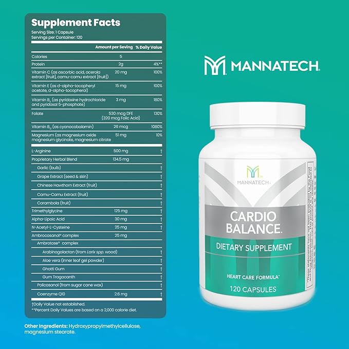 Mannatech CardioBALANCE®, Formulated with Folic Acid, L-Arginine & CoQ10, Vitamin C, Vitamin E, Vitamin B6 & Vitamin B12-90 Capsules.