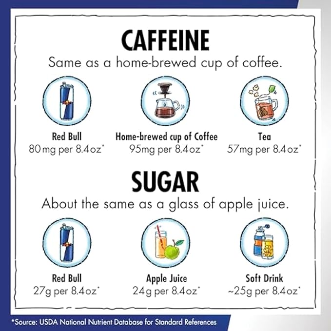 - Each 8.4 fl oz can contains 110 calories, 80mg of caffeine which helps to increase alertness, plus 26g of real sugar similar to a glass of apple juice of the same size