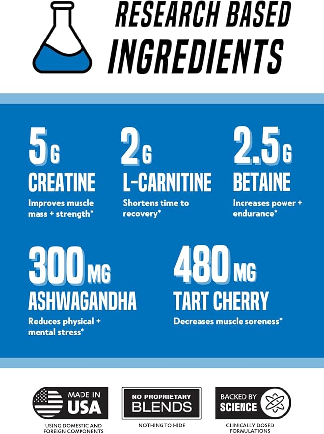 - Backed By Science: Our deliciously flavored post-workout powder for men and women contains ingredients backed by peer-reviewed scientific research at the proper dose to maximize your muscle recovery, including Creatine Monohydrate, Betaine, Tart Cherry Powder, and L-Carnitine