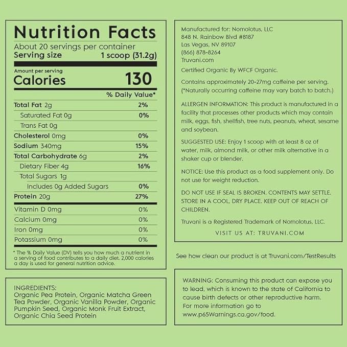 Truvani Vegan Pea Protein Powder | Matcha | 20g Organic Plant Based Protein | 20 Servings | Keto | Gluten & Dairy Free | Low Carb | No Added Sugar