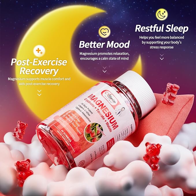 - Restore Your Original Rhythm: Our magnesium glycinate malate gummies not only help replenish magnesium deficiency but also assist you in returning to your natural, calm, and healthy rhythm amidst a busy life. Added Vitamin C and Zinc work together to support energy production and collagen synthesis. Each bottle of Raspberry Gummies is compact and easy to carry, containing 60 vegan calcium magnesium supplements. Just take 2 gummies per day to enjoy a 2-month supply of energy anytime.