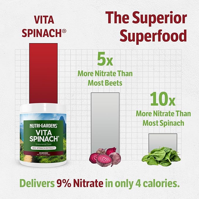 - Harness Nature's Power: Vita Spinach is an ancient all-natural pre-workout superfood with 5x more naturally occurring nitrates than other superfoods . Packed with effective nutrients, to keep you going stronger for longer.