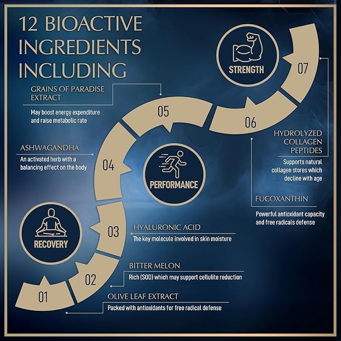 - MARINE COLLAGEN PEPTIDES & GRASS FED COLLAGEN COMPLEX. Includes fish collagen, eggshell collagen, chromium & multiple active superfood ingredients like olive leaf extract, ashwagandha and fucoxanthin.