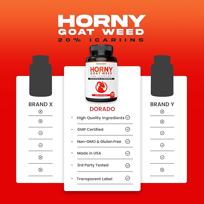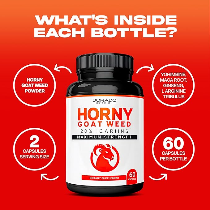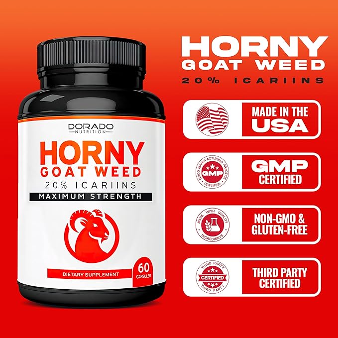 - HORNY GOAT WEED 20% Icariins - This powerful Horny Goat Weed 20% Icariins may promote Blood Flow, Circulation, Energy, and Joint + Back Support. Start your day on top & dominate all aspects of your life by adding Dorado’s Horny Goat Weed supplement to your daily routine! Don’t believe us? Check our customer feedback!
