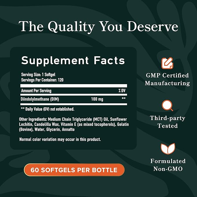 - 4-MONTH SUPPLY: Just 1 softgel per day provides an easy 100mg of DIM. Plus, every bottle contains 120 softgels (a 4-month supply)!