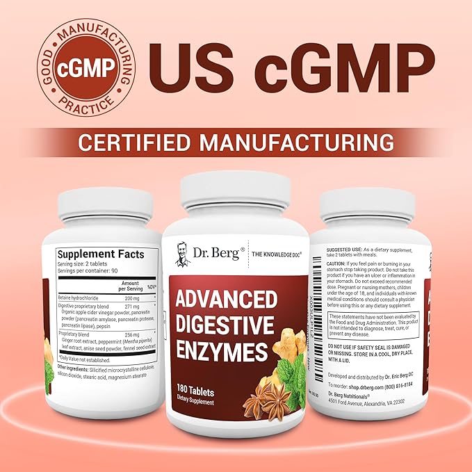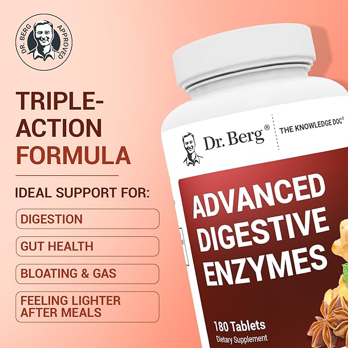 Dr. Berg Advanced Digestive Enzymes with Apple Cider Vinegar - Includes Digestive Health Ingredients Like Betaine Hydrochloride (HCI), Ginger Root & Peppermint Leaf - 180 Tablets