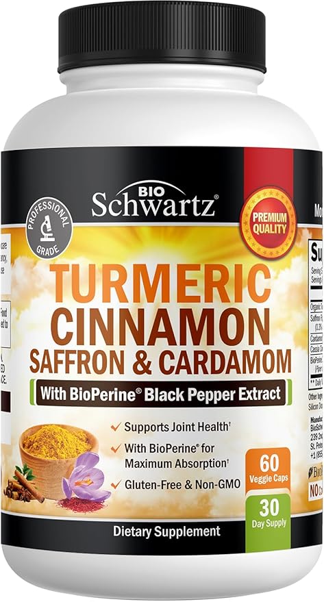 - Extra Strength Turmeric Curcumin Cinnamon Saffron & Cardamom: Our ultra high purity turmeric curcumin, cinnamon, saffron and cardamom supplement's nutrient and antioxidant-rich formula offers natural immune, heart and joint support