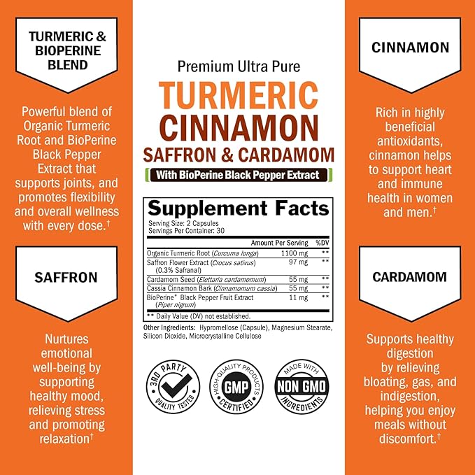 - 30-Day Supply: Enjoy a full month's worth of daily support with your bottle of our Turmeric Cinnamon Saffron & Cardamom