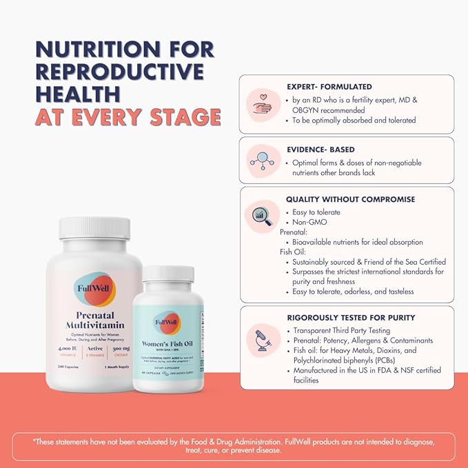 - NO COMPROMISING & ALWAYS FRESH: In creating FullWell Prenatal Multivitamin + Fish Oil, we aimed to make a well-tolerated, bioavailable multivitamin without compromising the amounts, forms, or quality of the nutrients that help support fertility and long term overall health. The Manufacture Date (MFG) represents when the product was made & helps assess freshness.