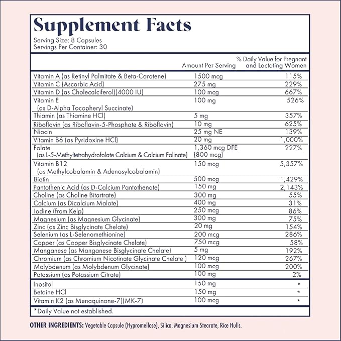 - PRENATAL MULTIVITAMIN: Our multivitamin has 4,000 IU of vitamin D, active B Vitamins, and chelated minerals. Other key ingredients include folate, which helps support your baby's growth and heart development, choline, which helps with brain development & placental function, and vitamin D, which helps skeletal growth and development, healthy blood pressure levels, and baby's immune system.