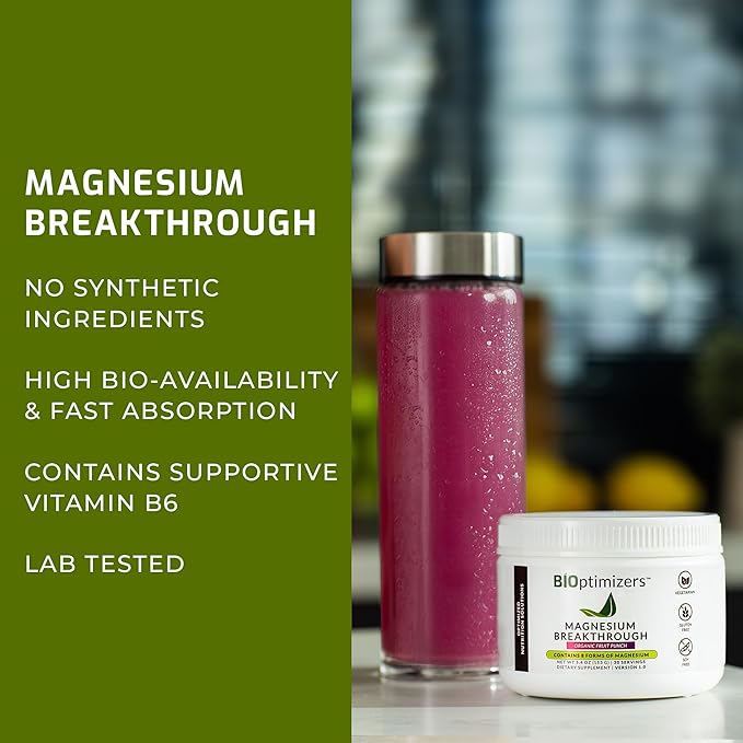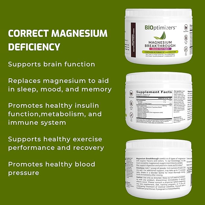 BiOptimizers Magnesium Breakthrough Drink Fruit Punch - 8 Forms of Magnesium: Glycinate, Malate, Citrate, and More - Natural Sleep and Brain Supplement – 5.4 oz (30 Servings)