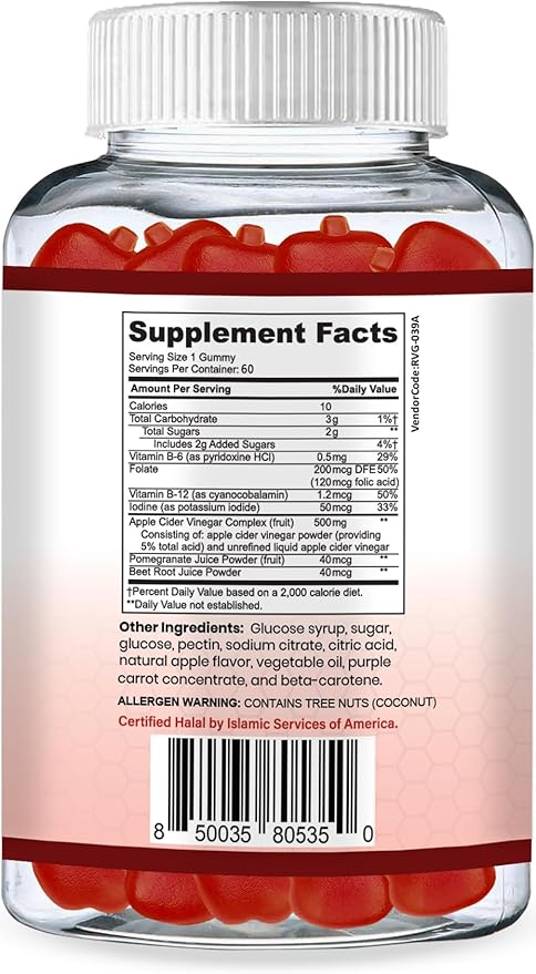 - 💪 500MG HALAL ACV KETO GUMMIES : Along with 500mg of Apple Cider Vinegar Gummies with the mother, B6, B12 and Folate, our apple vinegar gummy is Halal, Vegan, Gelatin free and Non-GMO