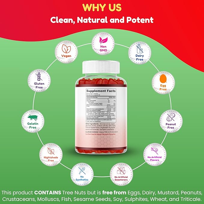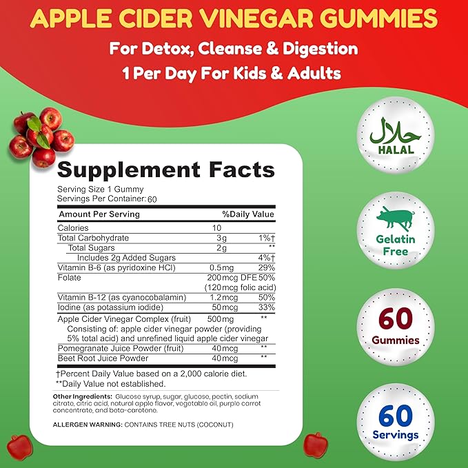 Halal Apple Cider Vinegar Gummies. Cleanse & Detox ACV Gummies for Immune Support & Digestion. Vegan, Non-GMO, Keto Friendly, Gelatin Free Apple Cider Gummies. 60 Count, 60 Servings