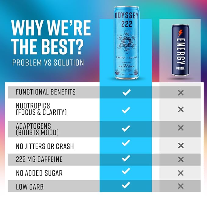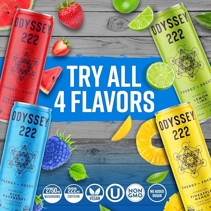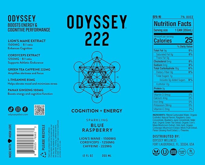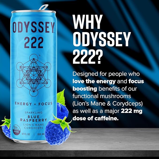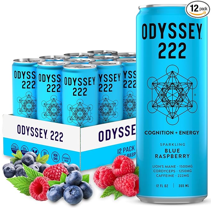 Odyssey 222 Energy Drink, Pre Workout, 222mg Caffeine, Clean Energy Drinks, L Theanine, Lions Mane, Cordyceps & Green Tea for Energy, Focus & Mood Boost, Low Calorie, Blue Raspberry, 12 Fl oz, 12 Pack