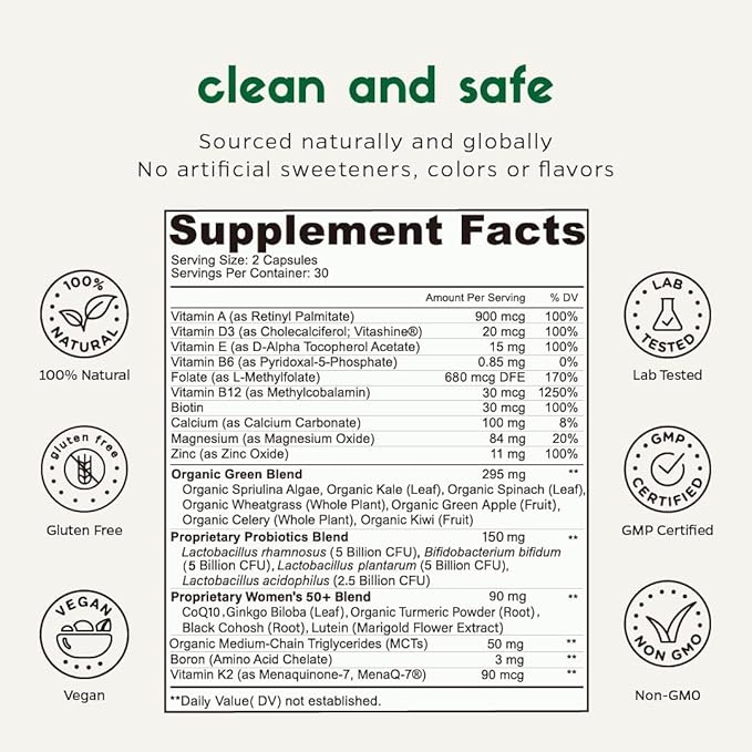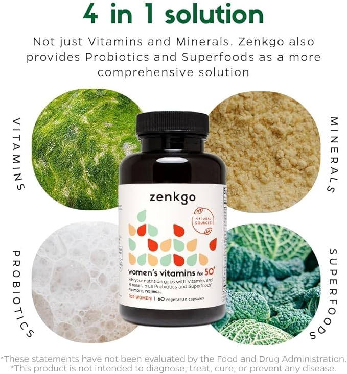 - 4-in-1 PLUS BALANCED FORMULA - An all-in-one multivitamin for women offering essential vitamins, minerals, probiotics, and organic whole foods sourced from nature. With the added benefits of Black Cohosh, filling the unique needs of women over 50. Zenkgo gives you just the right amount you need everyday.