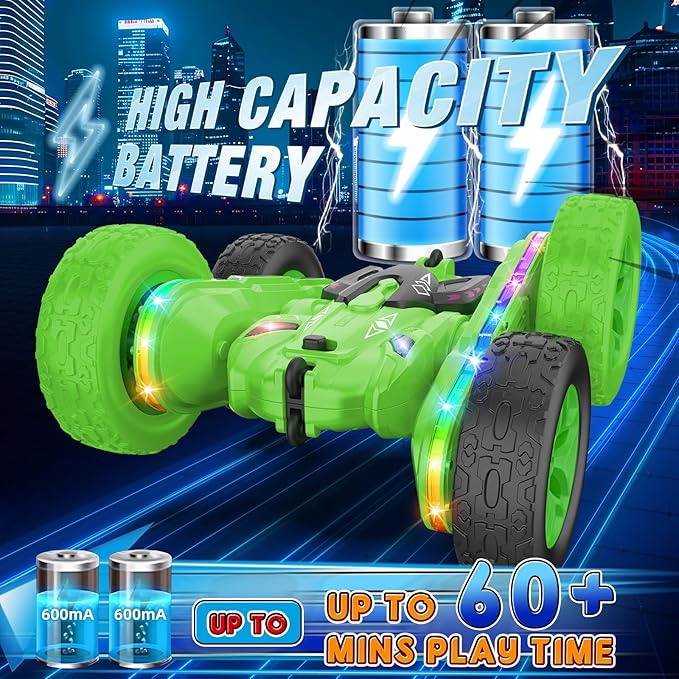 - [JIMDELLA REMOTE CONTROL STUNT CAR]-360 Flips Rotating Stunt RC Cars supports a variety of stunts. You can use the controller to control the car forward, backward, left turn, right turn, 360-degree rollover and rotation, bringing you unlimited fun. Both sides of RC Cars are equipped with cool colored headlights and color light strip, which can be turned on and off freely through the remote control.
