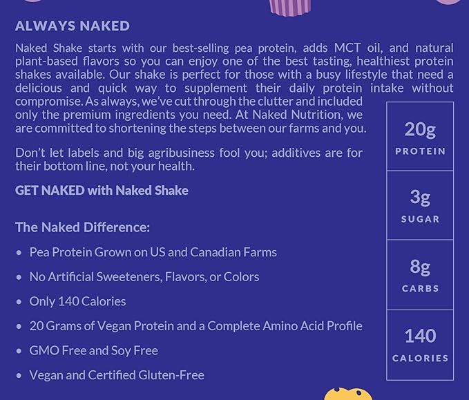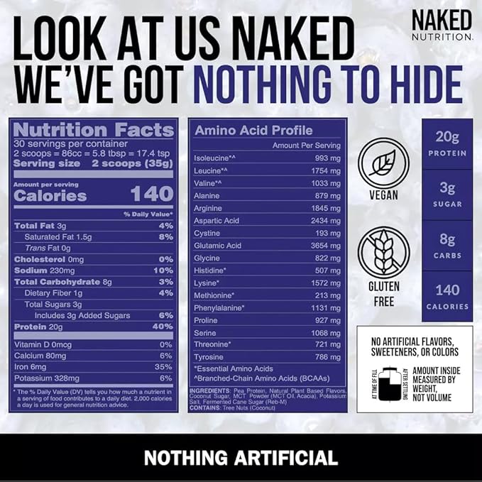 - SUPERIOR PLANT PROTEIN: Dairy-Free and vegan-friendly – made from yellow split peas grown in the USA and Canada. Blueberry Muffin Naked Shake offers a complete amino acid profile, making it the ideal source of fruit flavored protein powder.