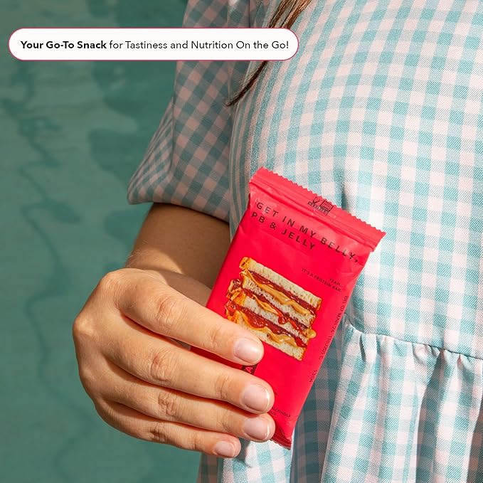 - TOO GOOD TO BE PROTEIN BARS: Meet the Get in My Belly, PB & Jelly Protein Bar! It's like spooning peanut butter and jelly straight from the jars, only better because it's healthier! Enjoy it as breakfast bars, a post workout snack, or for those uncontrollable sugar cravings!