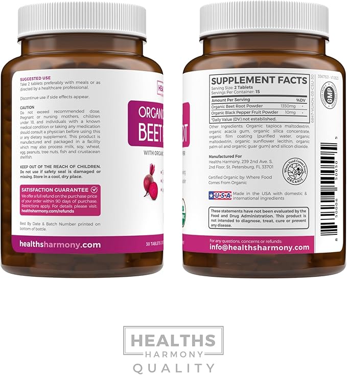 - Manufactured To Rigorous Standards: Every bottle of Healths Harmony premium beet root supplement is USDA Certified Organic, non-GMO, and made right here in the USA to rigorous cGMP manufacturing standards from global ingredients.