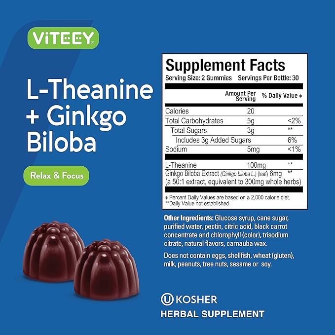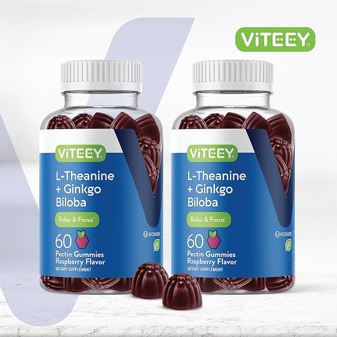 - RELAX & FOCUS - Our specially formulated L Theanine 100 mg + Ginkgo Biloba deliver the perfect combination that can help with focus & mood. It can assist with mental clarity and focus. Viteey's calming gummies for adults are perfectly formulated and combined for adults and teens. Easy & convenient to take at home or on the go.