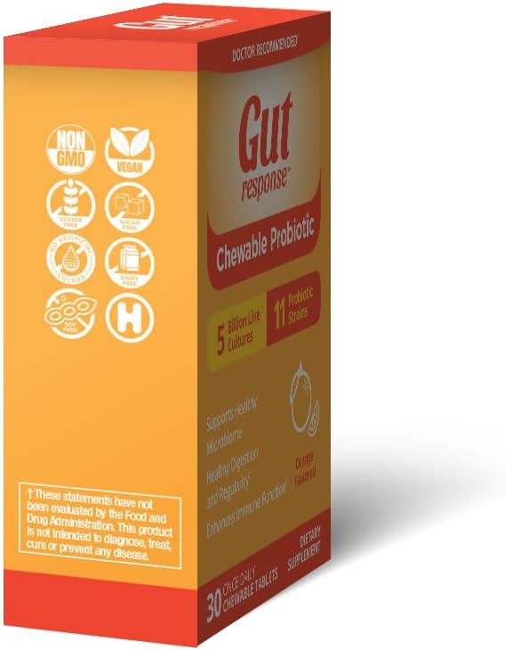 - NON-GMO, GLUTEN FREE & DAIRY FREE. Gut Response Chewable Probiotic is gluten free, non-GMO and dairy-free, providing convenience in an orange flavored chewable tablet.