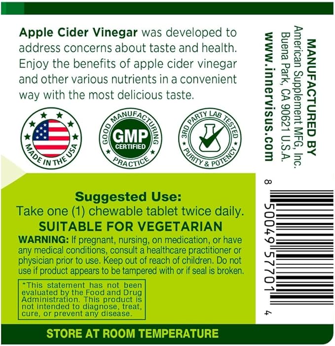 - SUGGESTED USE – Adults take one (1) chewable tablet twice daily. Each serving contains 1000mg of Apple Cider Vinegar, as well as many vitamins good for your health. Store at room temperature. If pregnant, nursing, on medication, or have any medical conditions, consult a healthcare practitioner or physician prior to use. Keep out of reach of children. Do not use if product appears to be tampered with or if seal is broken. Discontinue use and consult your doctor if any adverse reactions occur.