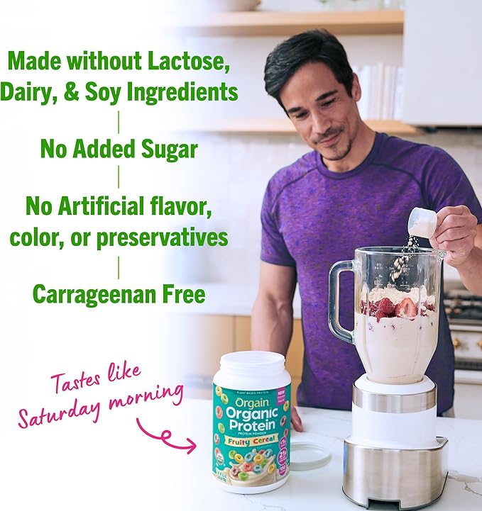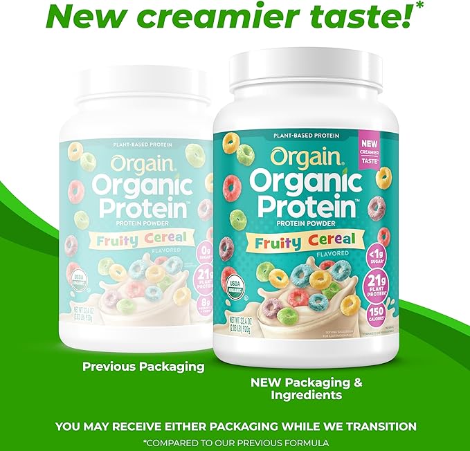 Orgain Organic Vegan Protein Powder, Fruity Cereal - 21g Plant Based Protein, 8g Prebiotic Fiber, Low Net Carb, No Lactose Ingredients, No Added Sugar, Non-GMO, For Shakes & Smoothies, 2.03 lb