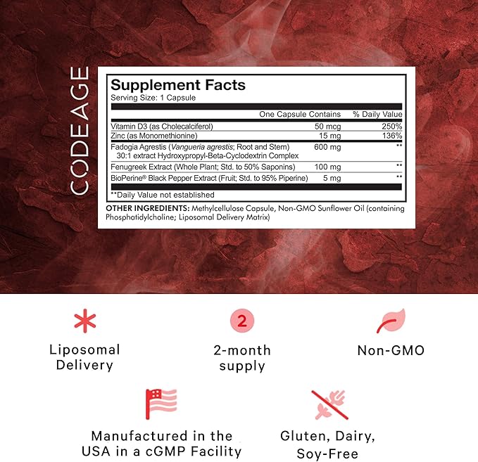 Codeage Liposomal Fadogia Agrestis 600mg Supplement - Fadogia Agrestis 30:1 Extract, Vitamin D3, Zinc, Fenugreek, BioPerine Black Pepper - 2-Month Supply - Liposomal Delivery - Non-GMO, 60 Capsules