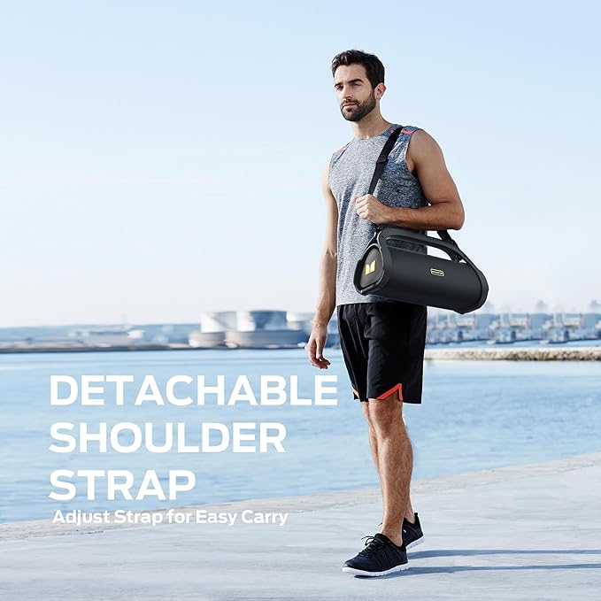 - 【Portable Bluetooth Speaker & Removable Baldric Included】-- Ergonomic all-in-one handle design makes the speaker can be easily lifted with one hand to take it anywhere. For the sake of humanization, the wireless bluetooth speaker includes an extra adjustable tear-resistant shoulder strap for more easy portability and is designed for active families and people on the move, catering to your needs throughout the day.